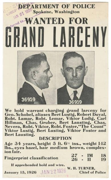 وثيقة تعود إلى عام 1931 صادرة عن مكتب التحقيقات تشير إلى فيكتور لوستيج بوصفه «محتالًا معروفًا على المستوى الدولي».