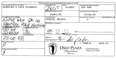 في 29 مايو 1995، أوسلو، النرويج سجّلت المرأة دخولها إلى فندق راقٍ دون استخدام بطاقة ائتمان، مستعملةً اسماً مستعاراً : “جينيفر فيرغيت”. وتذكر تقارير متضاربة أنها ربما كانت برفقة رجل يُدعى “لويس فيرغيت”، أُضيف لاحقاً إلى سجل الغرفة. كتبت “جينيفر” عنواناً غير موجود في بلجيكا على بطاقة التسجيل، ودوّنت تاريخ ميلاد يُظهر أنها في الحادية والعشرين، بينما قدّر اختصاصيو الطب الشرعي عمرها بنحو ثلاثين عاماً. وكما ورد في سلسلة نتفلكس “ألغاز غير محلولة”، قضت الأيام التالية خارج الغرفة مع تعليق لافتة “الرجاء عدم الإزعاج” على الباب.